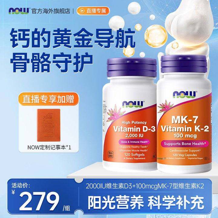 NOW诺奥维生素d3k2成人备2000IU孕妇VD高活25羟基MK7型K2美国进口