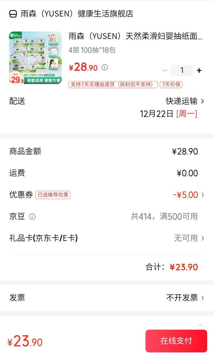 23.9💰 雨森天然柔滑抽纸 4层100抽*18包