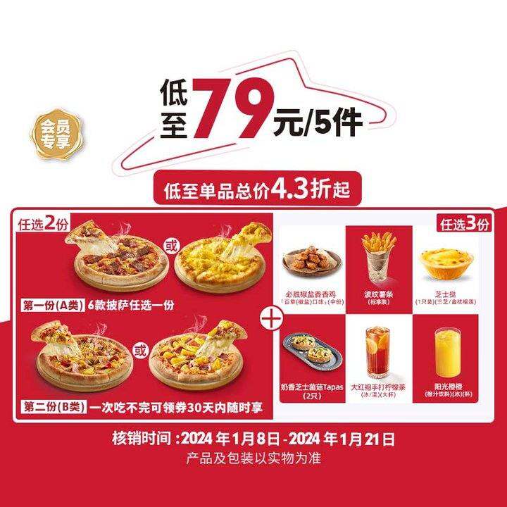 【79元5件】 必胜客 披萨小食饮品5件套 可外送电子优惠券