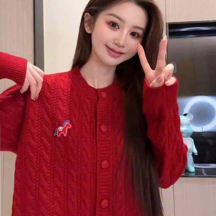 2026马年新款红色毛衣开衫女秋冬软糯宽松可外穿内搭麻花针织外套