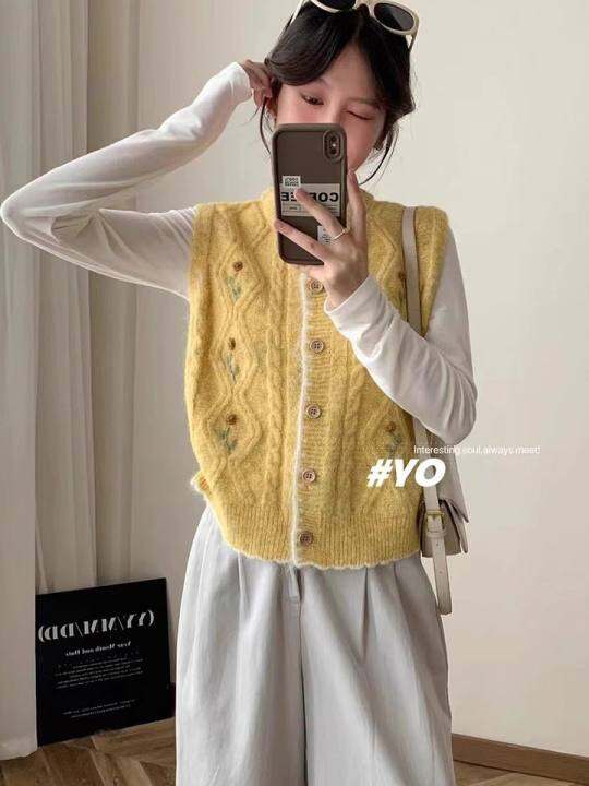 无袖圆领针织马甲背心女春秋款外搭宽松坎肩叠穿刺绣花朵马夹上衣