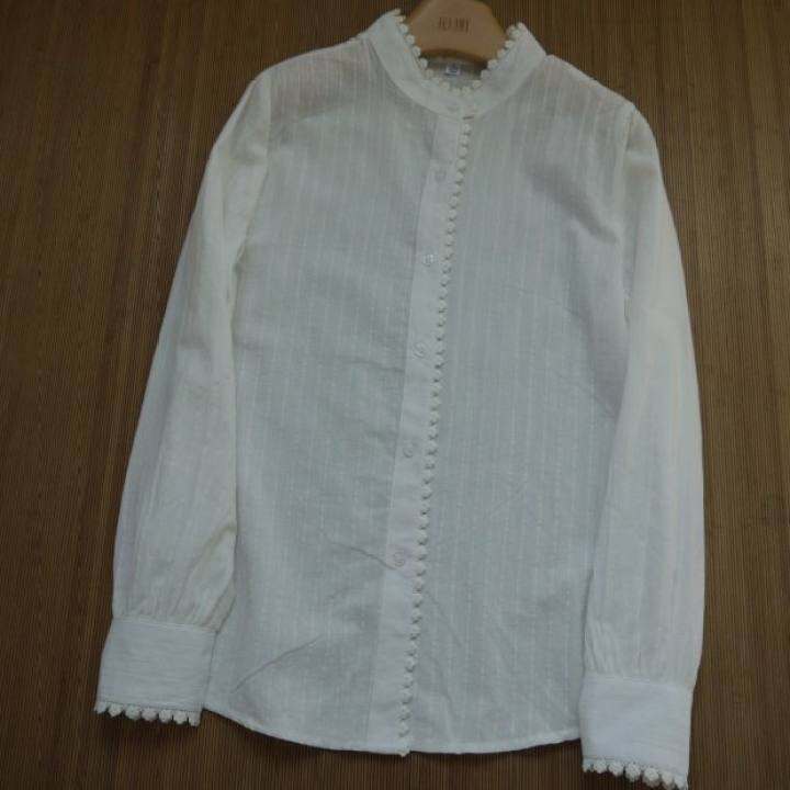 外贸单春夏薄款女装长袖衬衫纯棉轻薄立领蕾丝边通勤知性衬衫素色
