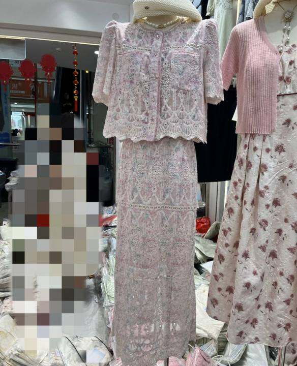 蕾丝半身裙粉色小香风套装女夏名媛高端镂空上衣A字中长裙两件套