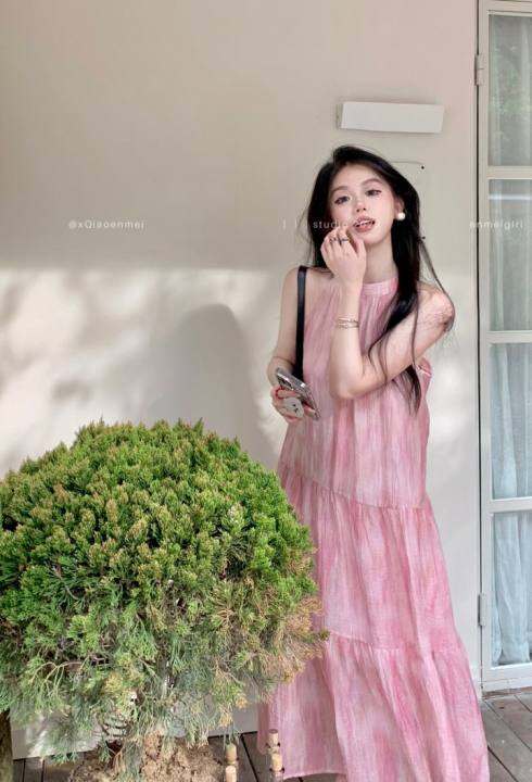 法式绝美挂脖连衣裙女夏季中长裙小个子粉色独特无袖海边扎染裙子