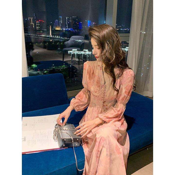 邓六六优雅女人味茶歇裙温柔风收腰显瘦灯笼袖粉色碎花连衣裙女春