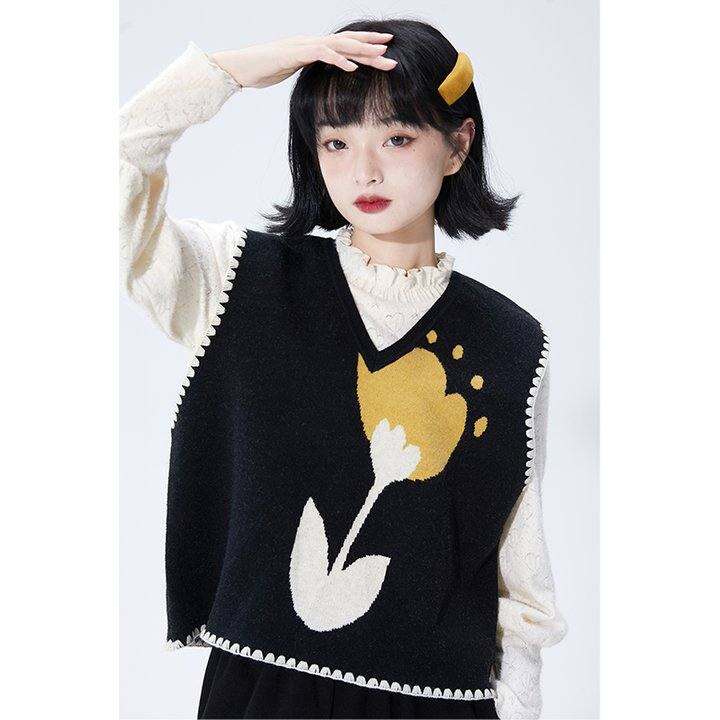 小葱良裁 黑色短款V领针织马甲女秋季宽松撞色贝壳绣无袖毛衣背心