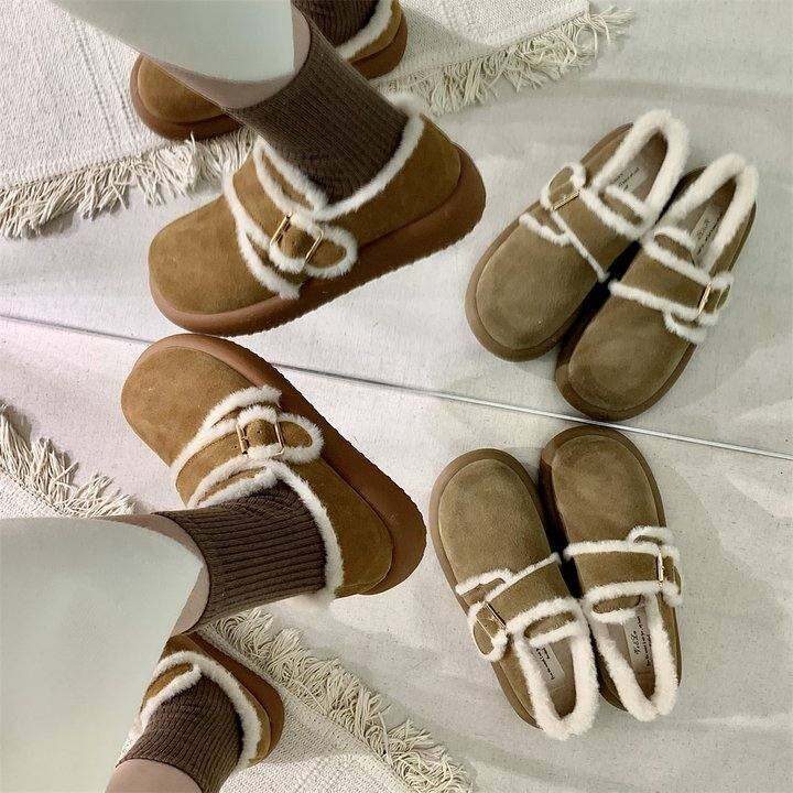 厚底真皮勃肯鞋女加绒洋气复古一脚蹬棉鞋毛毛鞋女冬外穿乐福鞋子