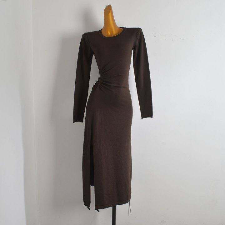 早秋薄款法式长袖圆领连衣裙女修身显瘦褶皱长款包臀开叉针织长裙