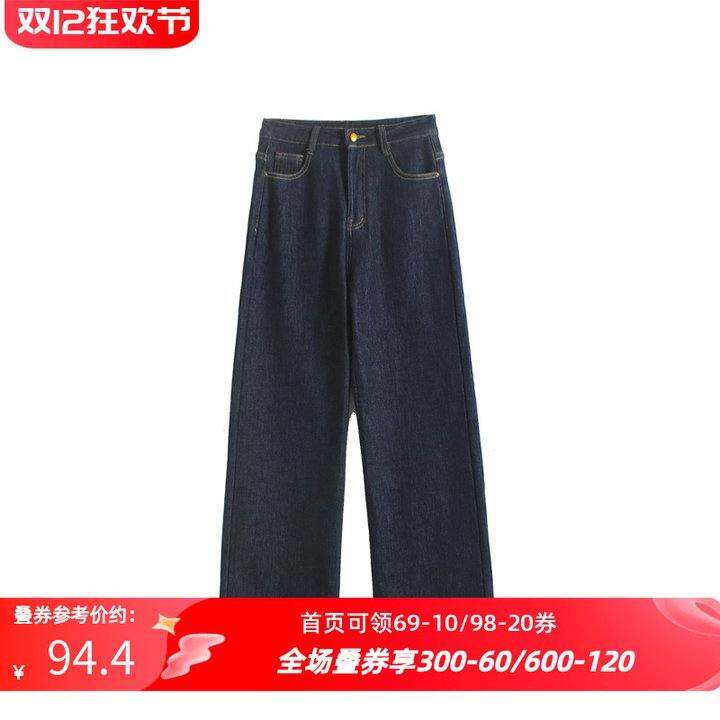 丹宁蓝加绒加厚直筒裤复古牛仔裤女2024冬季新款显瘦显腿长阔腿裤