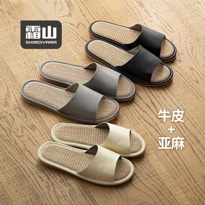 霜山日式牛皮亚麻凉拖鞋女夏季防滑吸汗室内软底男情侣家居拖鞋