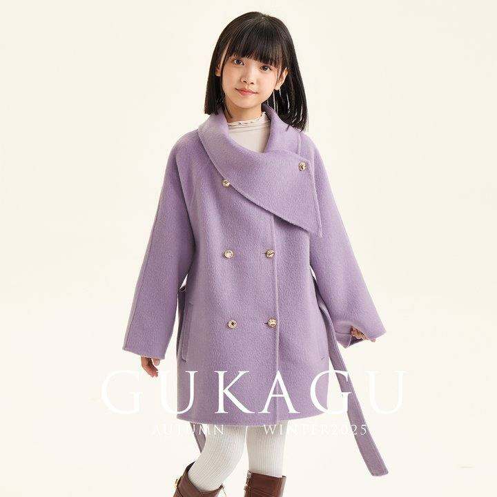GUKAGU丨100%羊毛女童双面呢羊毛大衣2025秋冬新款中长腰带款外套