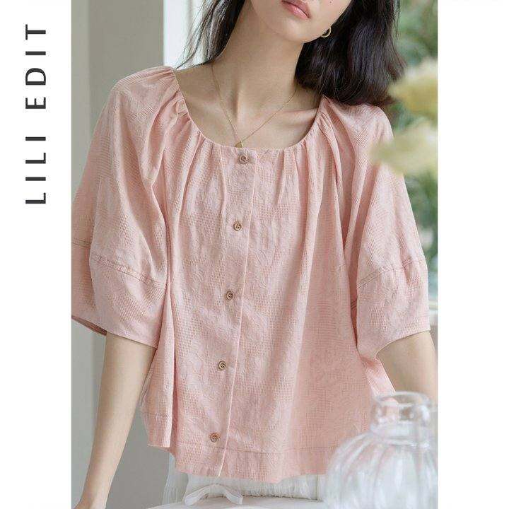 LILI EDIT/暗花纹阔袖衬衫女夏季新款法式文艺感圆领宽松短袖小衫
