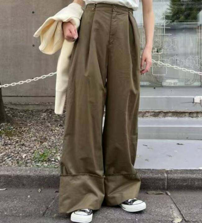 日单柜牌剪标,女式松紧腰衔扣饰裤脚挽边直筒裤