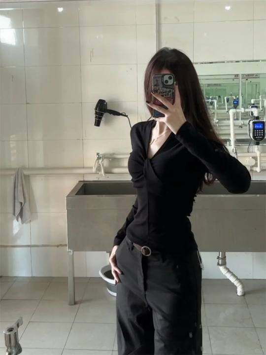 黑色内搭打底衫女秋冬修身V领纯欲独特绝美小上衣御姐性感辣妹春