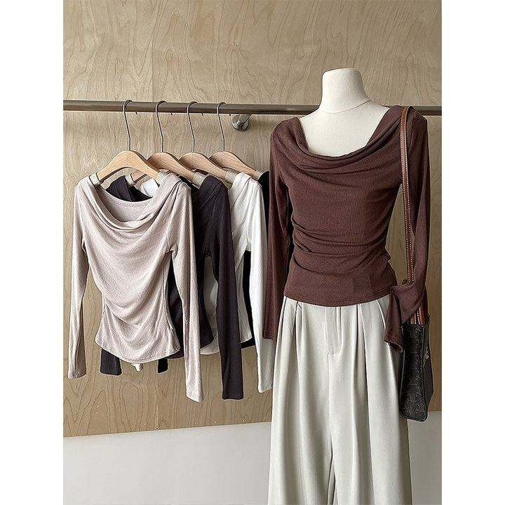 RENA绝美一字肩荡领小性感露肩修身长袖T恤女2024秋百搭气质上衣