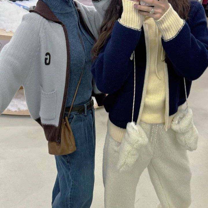 覆古韩范儿~韩国25秋冬撞色翻领双向拉炼厚实针织毛衣短外套女2色