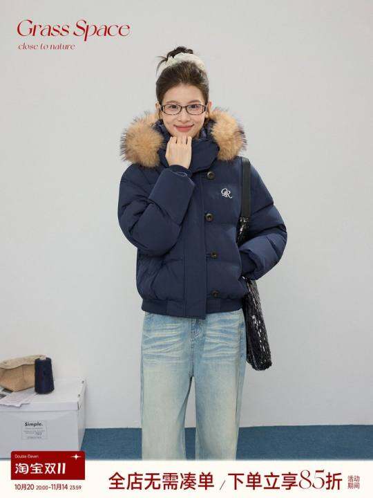 原野空间GRASS SPACE藏青连帽可拆卸毛领棉服女冬保暖棉衣外套潮