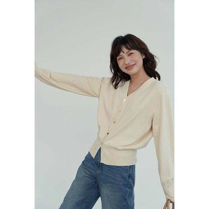 简约百搭v领针织开衫毛衣女早秋季收腰显瘦外穿短款白色上衣外套