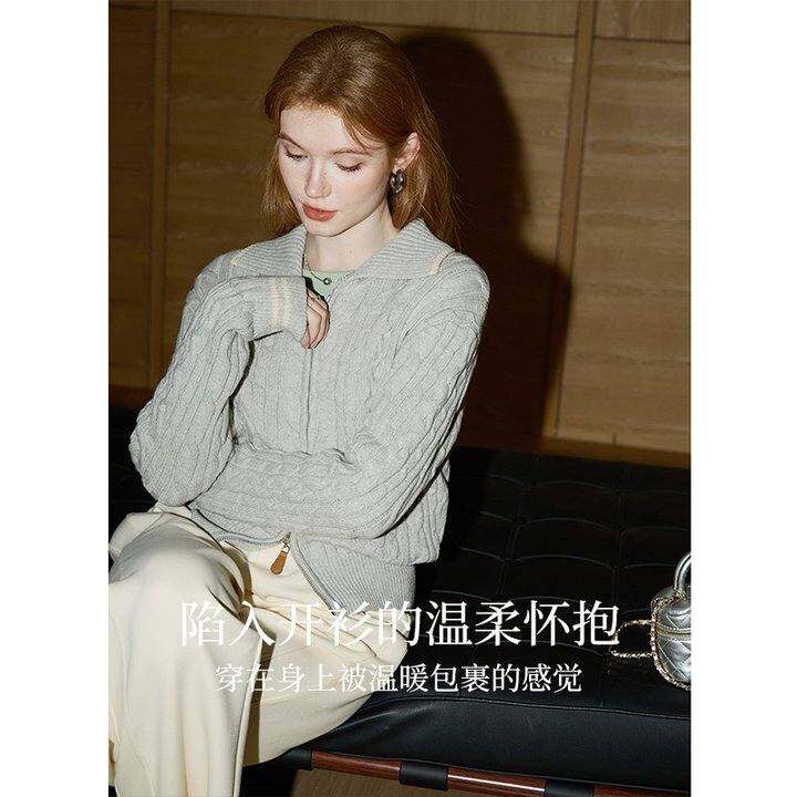 【双拉链】库恩玛维灰色麻花毛衣女装2024年秋季新款短款针织开衫