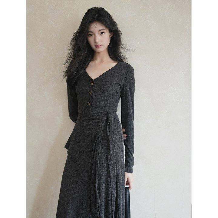 贰羊设计【长留】国风新中式极简花纱针织v领斜裁修身连衣裙女