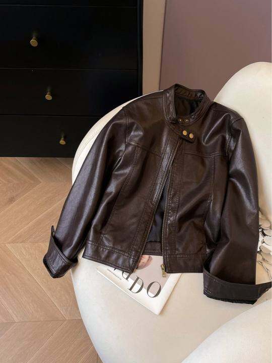 小C家 覆古咖色皮衣外套女2025新款秋季立领机车服美拉德风皮夹克