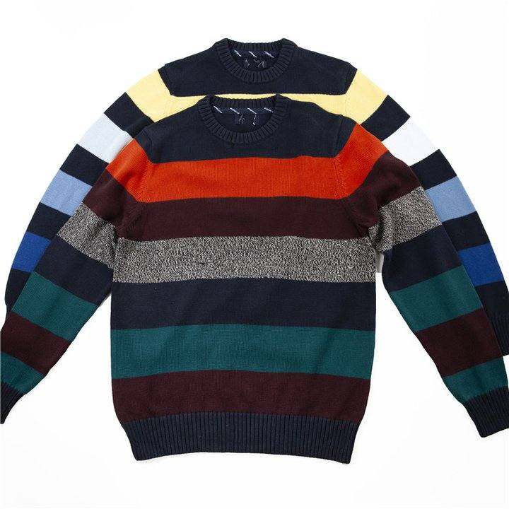 95%棉!外贸尾货男套头毛线圆领条纹直筒针织衫毛衣大码加肥
