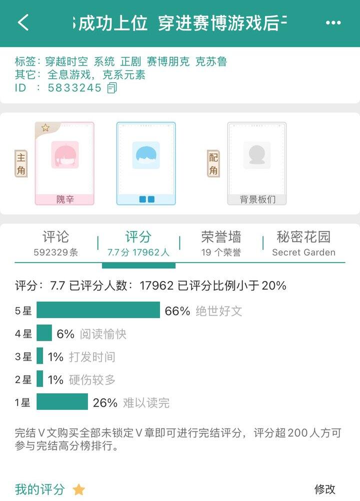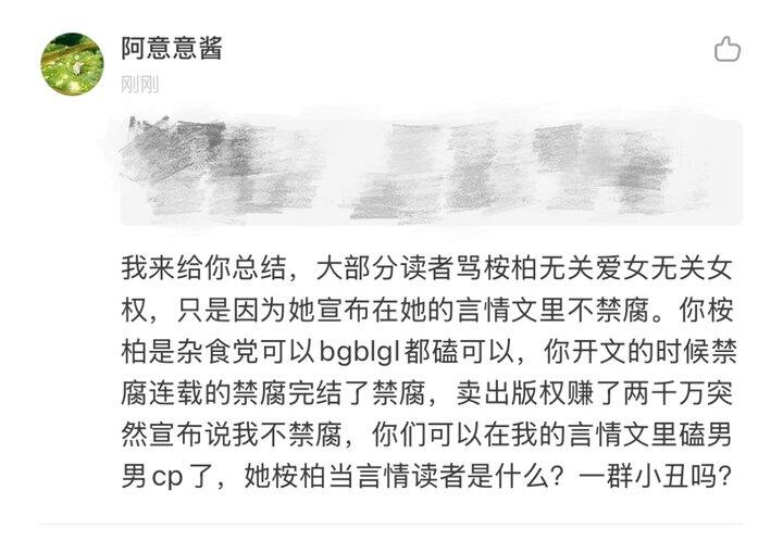 我发誓真的最后一条了,发完就睡💤我生气的点从来不是她爱不爱女,单纯讨厌她两面三刀反复横跳,愤怒于读者在为书里的女主维权时身为作者的她却视而不见,太不把读者当人。我一没举报二没开盒,只是作为全订读者给到作者一个一星,如果这样还要说手段激烈针对女作者,那我无话可说。