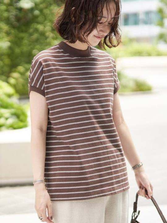 夏摩初秋季女士高领纯棉连肩袖短袖T恤宽松版型简约搭配日单