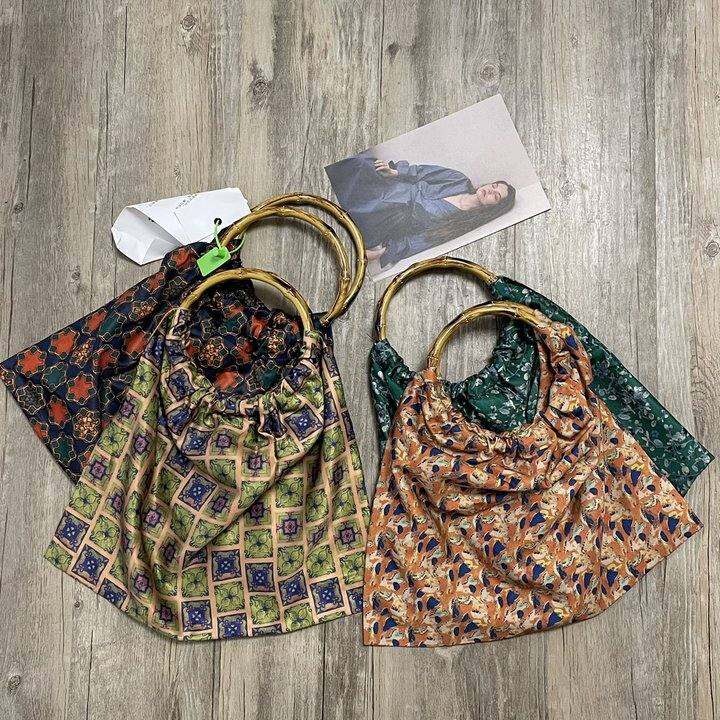 包邮 新中式国风 仿绸面几何碎花复古花纹 竹把手提包布艺包