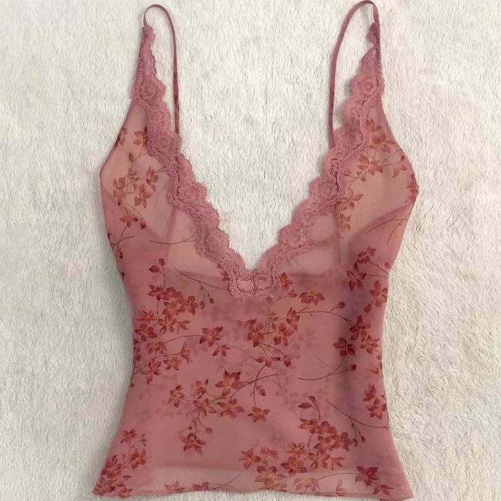怒推!外贸单品质,红色蕾丝吊带绝美碎花上衣女夏季独特漂亮背心