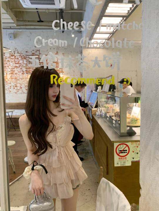 你家辣辣 古早甜妹/藕粉色重工蕾丝拼接吊带上衣收腰显瘦蛋糕小衫