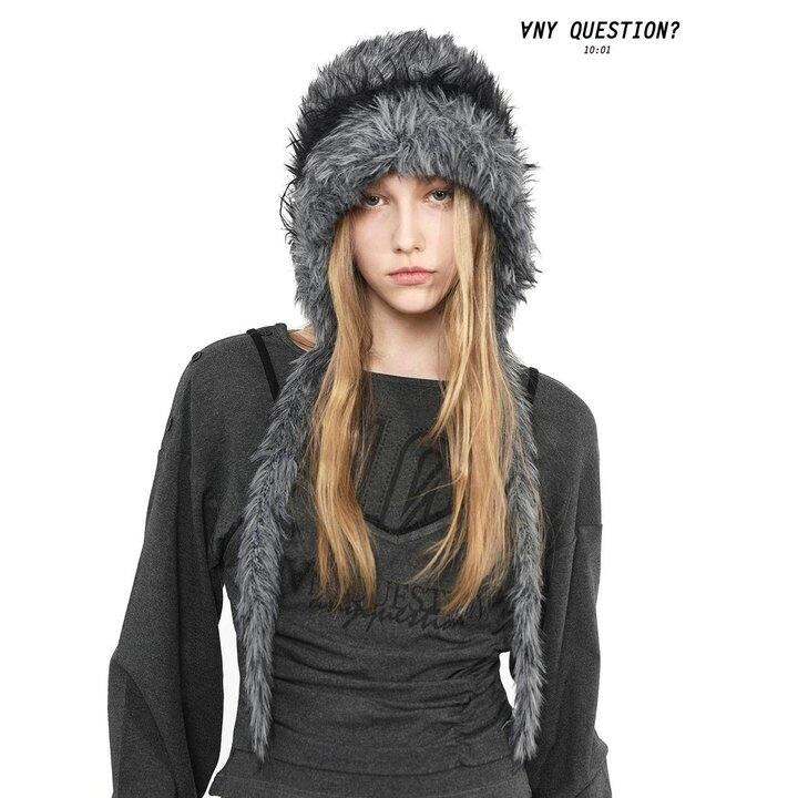 ANYQUESTION独家原创正品 黑灰/白灰双色 长毛绒混纺针织护耳帽