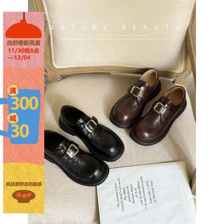 自然卷复古英伦风厚底小皮鞋秋季新款魔术贴方扣单鞋粗跟乐福鞋女