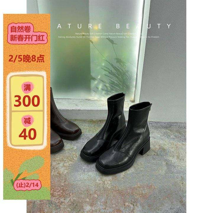 自然卷瘦瘦靴女方头百搭气质秋冬粗跟马丁靴女英伦通勤切尔西短靴