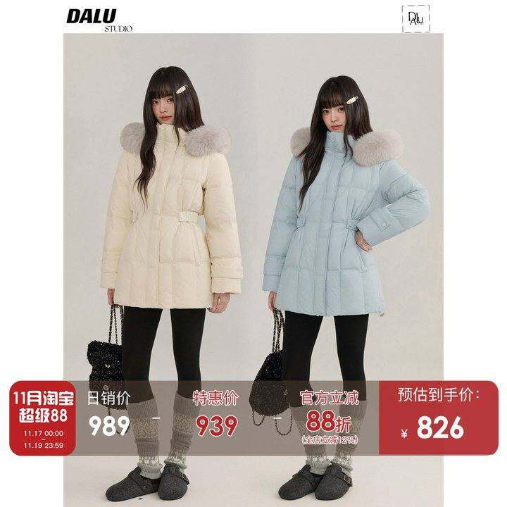 DALU 真狐狸毛领 90白鸭绒 收紧收腰设计 中长款羽绒服外套