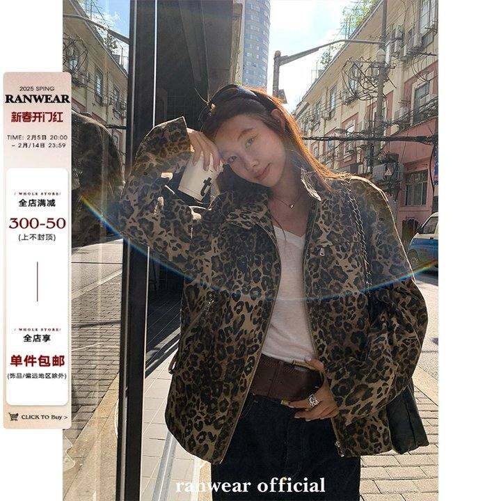 现货Ranwear 孝利oni小野猫豹纹重磅做旧复古摩登感夹克女短外套
