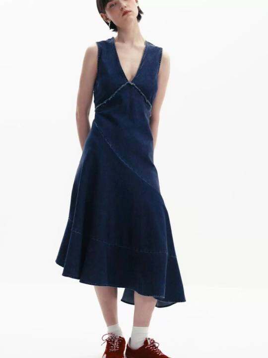 出西班牙欧美风连衣裙时髦修身V领拼接斜边中长款背心牛仔裙