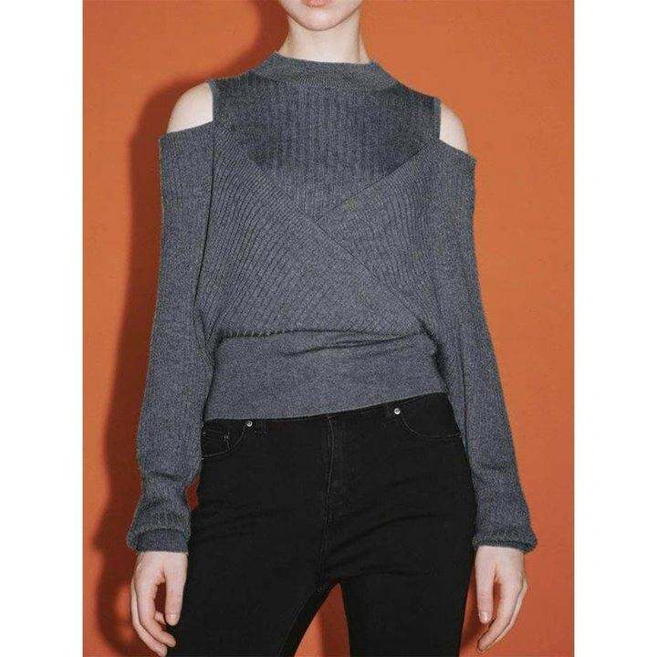 女装2024秋冬新款时尚圆领露肩镂空设计修身长袖针织衫女