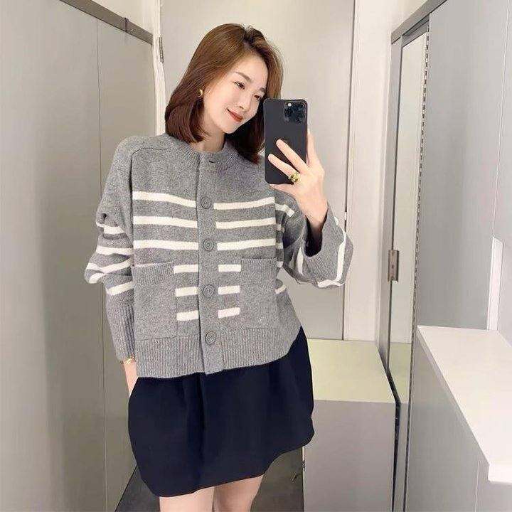 极简风女装2024秋冬新款休闲版型圆领通勤条纹针织开衫毛衣外套潮