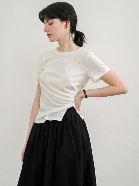纯白印记 褶皱开衩纯棉小衫正肩修身圆领T恤轻薄透气短袖上衣女