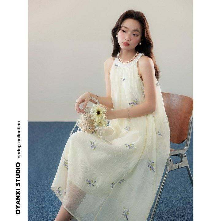 欧阳喜《浅月》法式温柔挂脖吊带长裙女夏季小个子宽松碎花连衣裙