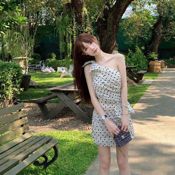 CHICYOU 小众du家白色波点蝴蝶结性感斜肩显瘦气质修身收腰连衣裙