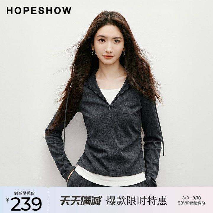 红袖高级灰卫衣2025春季新款女装抽褶收腰连帽领假两件撞色上衣