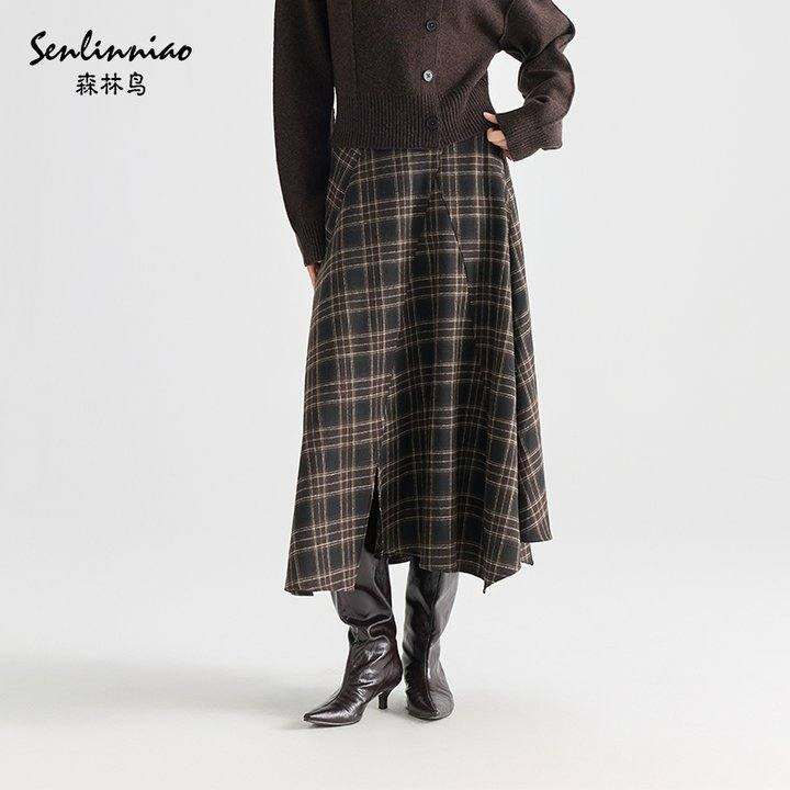 森林鸟商场同款复古格纹毛呢半身裙女 冬季新款不规则下摆a字裙子