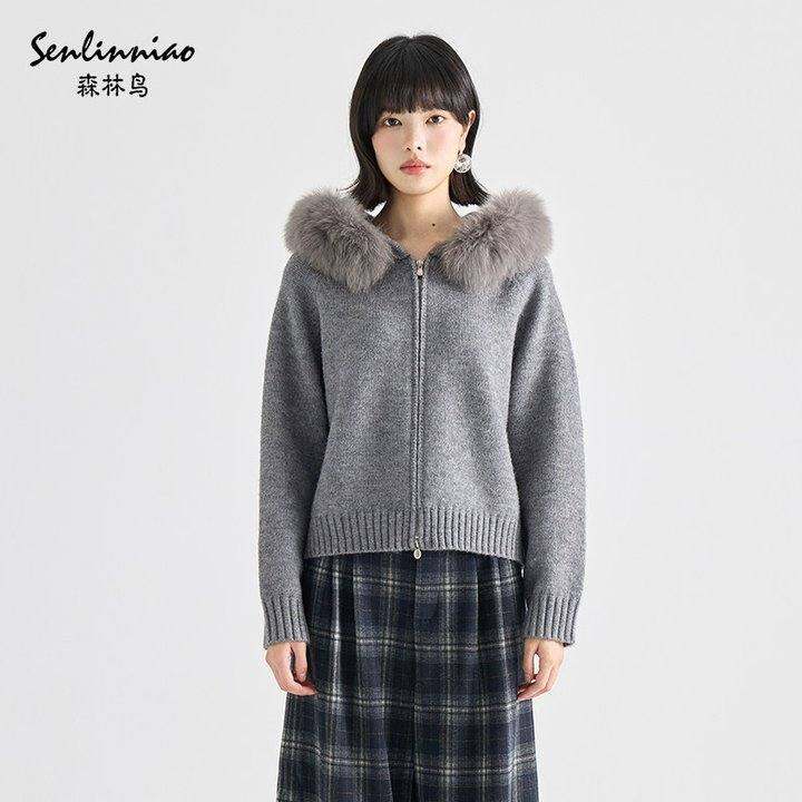 森林鸟商场同款老钱风狐狸毛领针织外套女冬季新款高级感短款毛衣