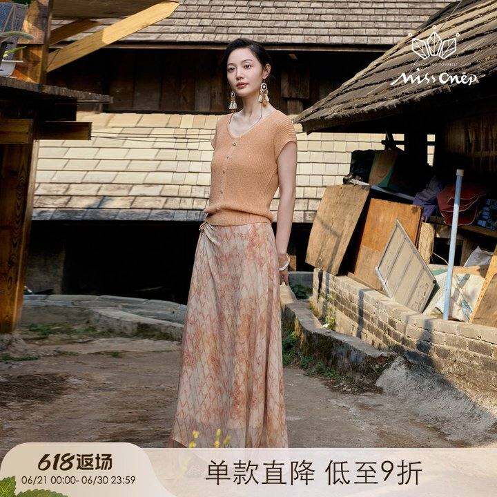 Missonep蝉【青玉岸】浪漫风针织短袖配印花半身裙搭配一整套夏季