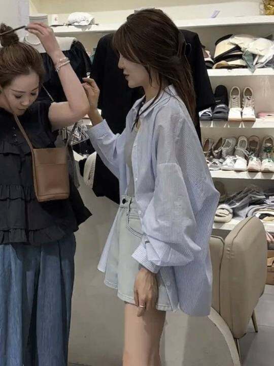 欧货薄款防晒条纹长袖衬衫女夏季新款宽松显瘦后背开叉休闲上衣潮