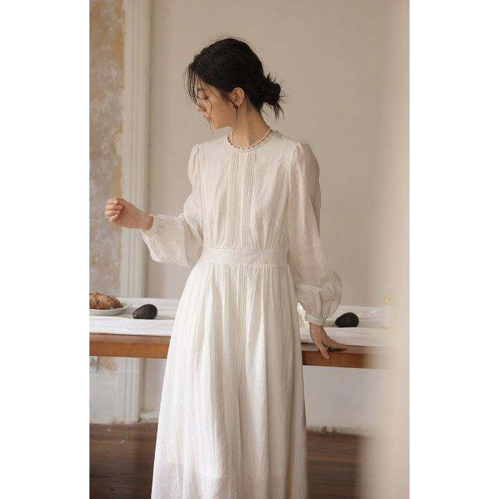 solighter法式复古苎麻长袖收腰连衣裙女早秋2024新款灯笼袖长裙