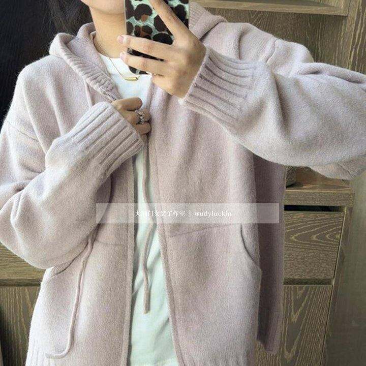 大脑门 5色~韩风双拉链抽绳宽松慵懒风连帽针织外穿开衫Q24277