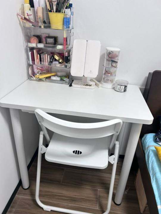 化妆桌买的这个,桌板很厚,桌腿也是加粗的,很稳!质量很不错!也是跟着路友买的